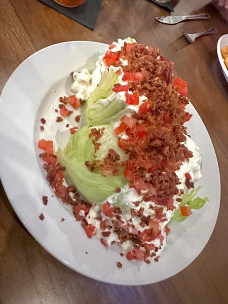 Not to be outdone is the Santa Fe Salad with romaine, avocado, tomato, cheddar, fire-roasted corn, black beans, and crispy tortilla chips. The Caesar Salad is a good staple, too.
