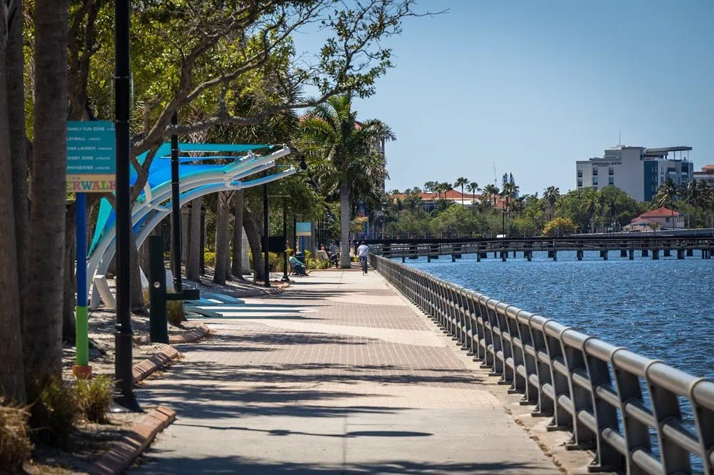 The Bradenton Riverwalk is a world-class outdoor gathering space located in downtown Bradenton along the Manatee River. It’s a 1.5-mile, ADA-accessible park with many features including an amphitheater, skate park, splash pad, playground, beach volleyball, a fishing pier, and plenty of outdoor public art.