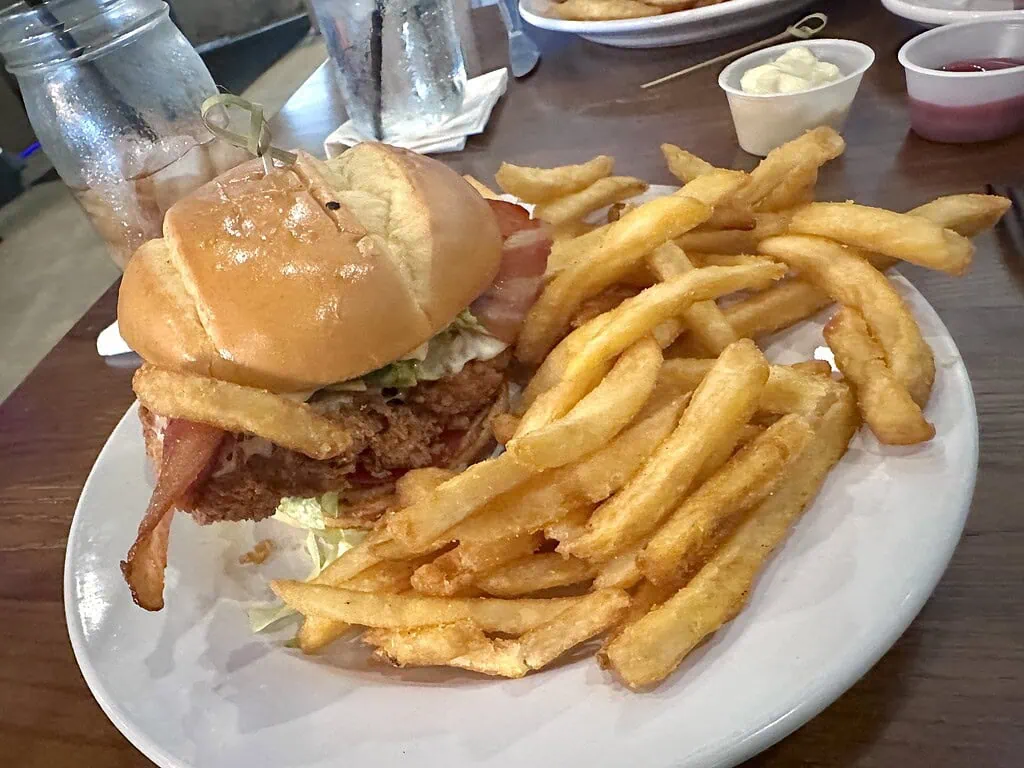 Running down the menu, we find sandwiches and burgers. You can choose from delicious options like the Black + Blue Burger with applewood smoked bacon and bleu cheese, the Just a Cheeseburger with American cheese, or the Haymaker with applewood smoked bacon, onion straws, and guacamole. Other sandwiches include Buttermilk Fried Chicken, Grilled Buffalo Chicken, or the BBQ Pulled Pork Sandwich.