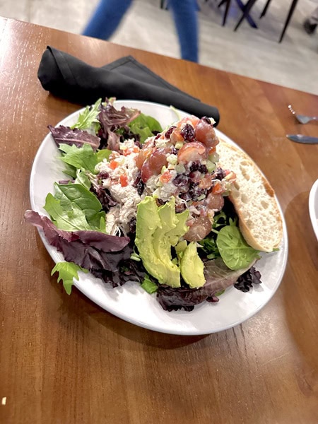 I have to say that salad portions are large, if not huge, and of course delicious. The Napa Chicken Salad is my favorite so far. It comes with a mound of chicken salad made from roasted pulled chicken breast, grapes, toasted almonds, celery, cranberries, avocado, and tomato on a bed of lettuce and Greek dressing.